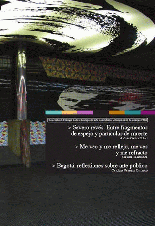 Severo revés: entre fragmentos de espejo y partículas de muerte / Andrés Gaitán Tobar. -- Introducción -- Óscar Muñoz y la evaporación del espejo. -- Doña Elvira contra el Collar-bomba. -- Alberto Baraya: ¿La destrucción de la imagen?. -- María Elvira Escallón y el sueño como reflejo de la muerte. -- Rolf Abderhalden: Un Marsias que niega la distancia. -- Bibliografía. -- Me veo y me reflejo, me ves y me refracto / Claudia Salamanca. -- Mirada hacia adentro: Una introducción. -- ¿Reflejos o refracciones?. -- Identidad: La dilatación del gesto. -- De refracciones a invisibilizaciones. -- Bibliografía. --Bogotá: reflexiones sobre arte público / Carolina Venegas Carrasco. -- El paradigma conmemorativo en Bogotá. -- Algunos quiebres del paradigma conmemorativo en espacio público. -- La escultura moderna en el espacio público bogotano. -- ¿Escultura o arquitectura?. -- Agotamiento del modelo. -- Bibliografía. -- Acta.
