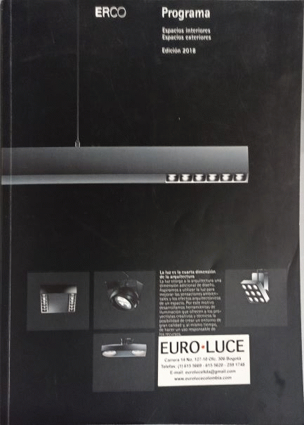 Introducción. -- Interior. -- Raíles electrificados y estructuras luminosas. -- Luminarias para raíles electrificados. -- Proyectos empotrables, bañadores empotrables y bañadores de pared empotrables. -- Luminarias empotrables en el techo. -- Luminarias de superficie. -- Luminarias pendulares. -- Luminarias para puestos de trabajo. -- Luminarias de pared. -- Luminarias empotrables de suelo. -- Exterior. -- Proyectores, bañadores y bañadores de pared. -- Luminarias de fachadas. -- Balizas. -- Luminarias empotrables en el techo. -- Luminarias de superficie. -- Luminarias empotrables de suelo. -- Anexo.