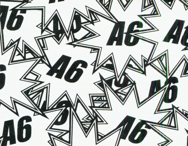 Anverso: composición gráfica en blanco y negro con múltiples repeticiones de la sigla “A6” en forma de estallido visual, remitiendo al diseño editorial de la publicación. Reverso: texto institucional con logos del IDCT, la Galería Santa Fe y la campaña “Bogotá sin indiferencia”.