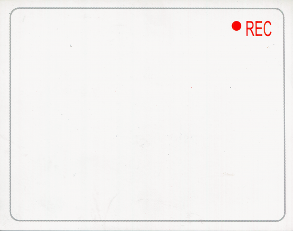 Anverso: diseño minimalista en blanco con tipografía negra sans serif. El texto central anuncia el título y autora. Incluye sello fechado “24 SEPT. 2004”. Reverso: diseño con recuadro gris simulando una pantalla de grabación y un punto rojo con la palabra “REC” en la esquina superior derecha.