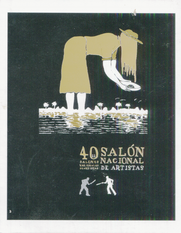 En el anverso, ilustración gráfica de una figura femenina inclinada que sostiene un plato con tierra o minerales, realizada en tonos dorados y blancos sobre fondo negro. En la parte inferior, el logotipo del 40 Salón Nacional de Artistas. En el reverso, texto institucional con logos del Ministerio de Cultura, Instituto Distrital de Cultura y Turismo (IDCT), Universidad Pedagógica y Tecnológica de Colombia (UPTC) y lema Bogotá sin indiferencia. Se menciona la obra “Minera nocturna” del autor Juan Maturana Asprilla.