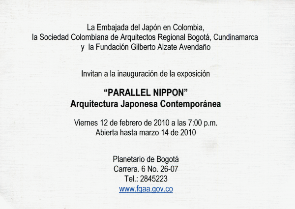 Summary: Invitación a la exposición Parallel Nippon, muestra internacional dedicada a la arquitectura japonesa contemporánea producida entre 1996 y 2006. La exposición, organizada por la Fundación Japón y presentada en Bogotá con el apoyo de instituciones locales, explora los cambios urbanos, sociales y tecnológicos del Japón contemporáneo a través de maquetas, fotografías y material audiovisual. Su itinerancia por Latinoamérica fortaleció los vínculos culturales entre Japón y Colombia en el campo del diseño y la arquitectura.
